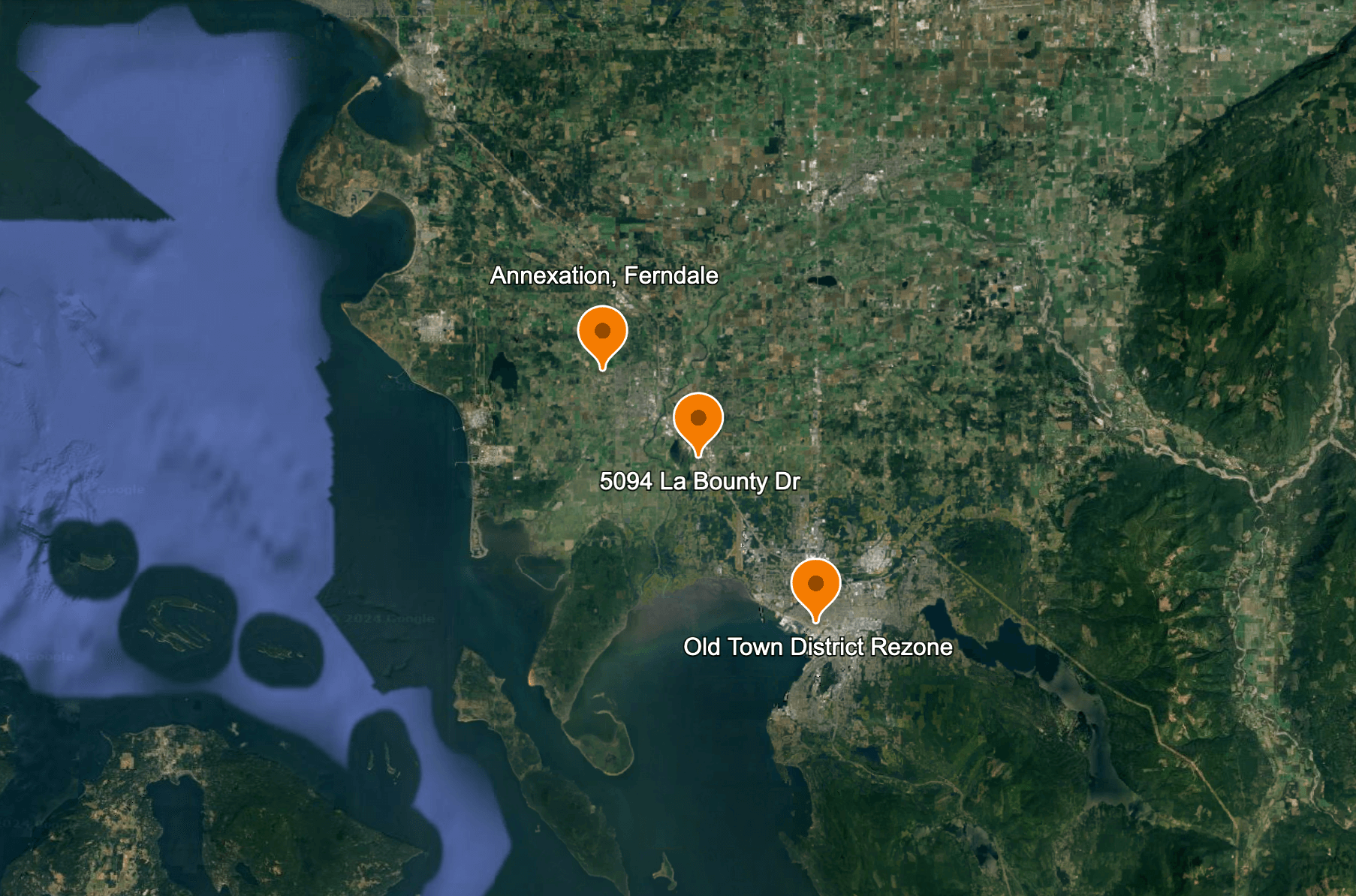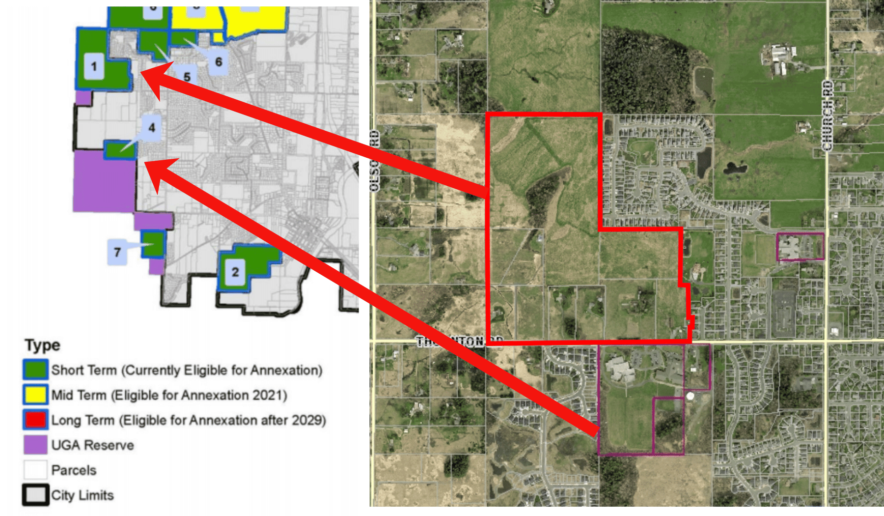 The Thornton Way Annexation was an annexation of 11 undeveloped properties on the west edge of the City of Ferndale, constituting approximately 110 acres of land. The combined properties are located across Thornton from City Elementary and Middle Schools in an area that is currently developing. The properties received residential single family medium zoning and are intended to be developed with a mix of detached and attached housing forms over the next decade.