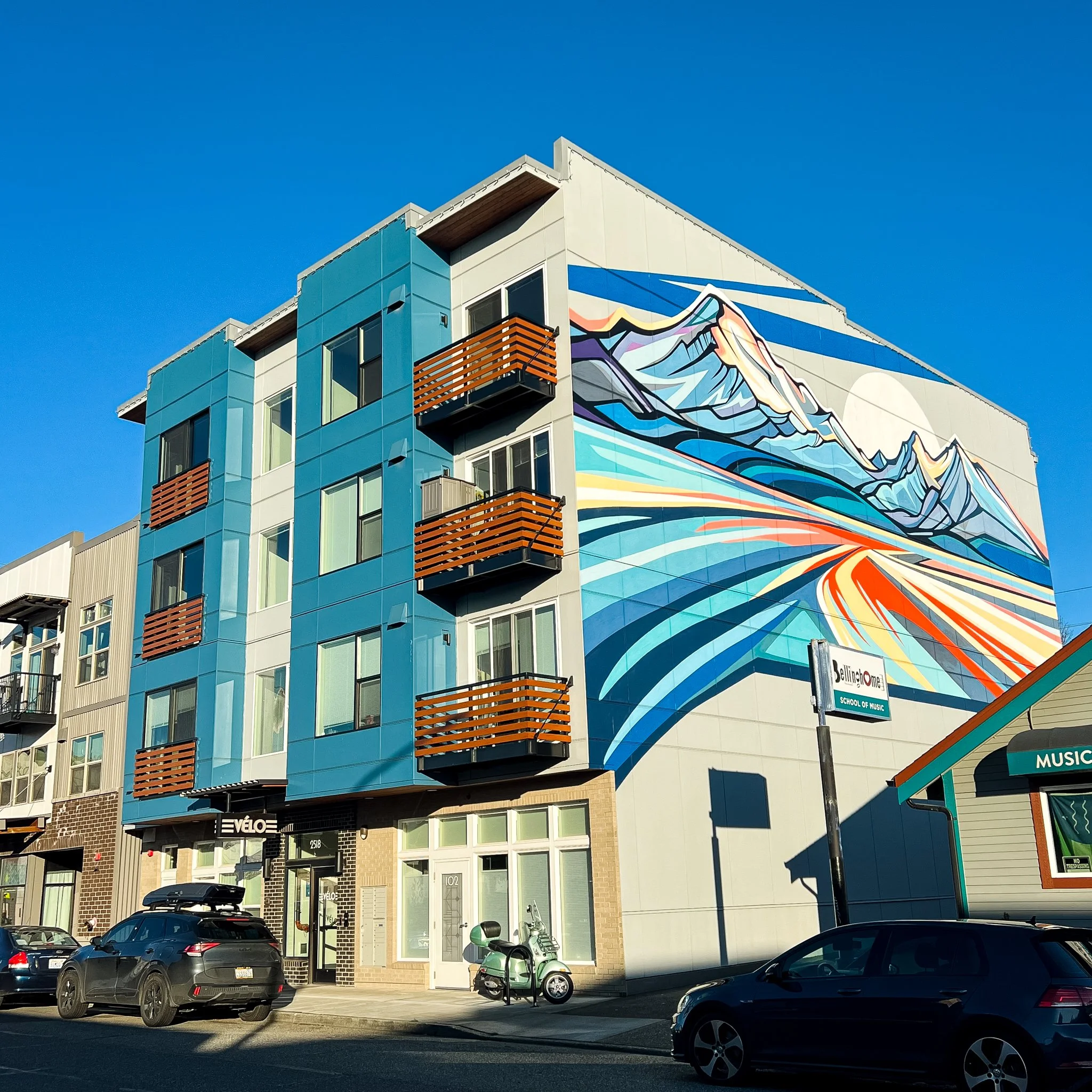 The Velo Apartments is a 4-story, 14-unit multi-family apartment located in the commercial core area of the Fountain Urban Village. The building incorporates a mix of studio, 1 bed and 2 bed rental units, a street-front commercial space, and parking off the alley. The building incorporates several unique design components, including parking reduction mitigation measures and a large mural on the building’s blank wall. The site was previously developed with a single-family residence, which was relocated 8 blocks to a vacant lot and then sold to a new homeowner.