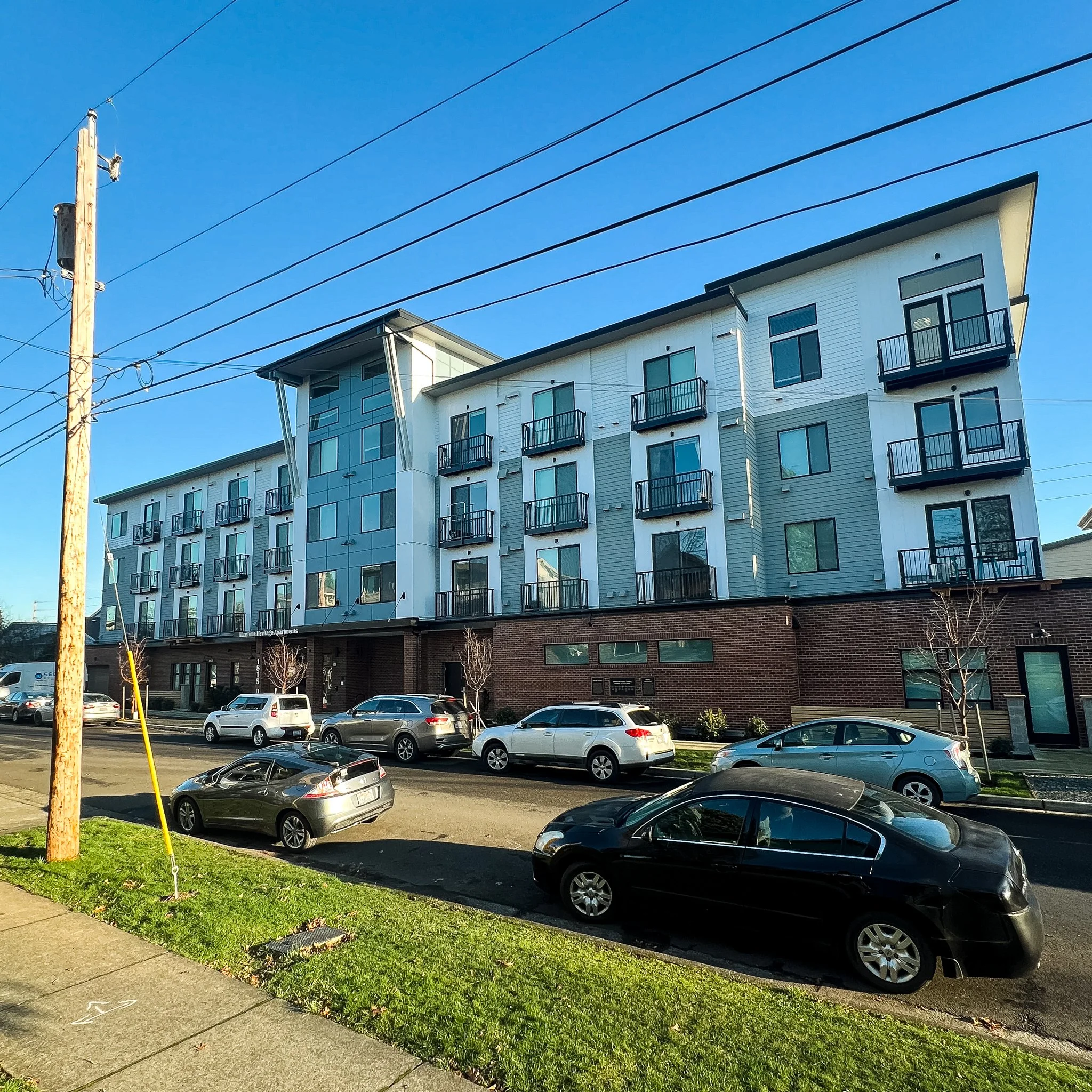 The Maritime Heritage Apartments is a 4 story, 128-unit multi-family apartment located in the residential transition area of the Downtown District Urban Village. The building spans a ½ block, and incorporates a mix of studio, 1 bed and 2 bed rental units, including walk up units on both street frontages and a large under building garage. On-site amenities include a gym, library/game room, a 2nd story interior courtyard, and a roof deck with commanding views of the Bay and Mountains. The site was previously developed with two single story office buildings; the Graham Pharmacy building was a historically significant glass and steel building, representing the Miesian architectural style. A bronze plaque tribute to this building, the owners and the architectural style is located on the building wall along the D St sidewalk.